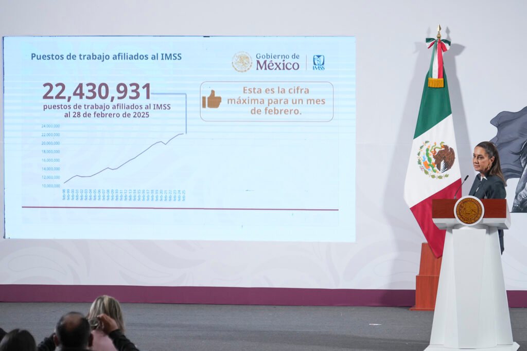 La presidenta de México, Claudia Sheinbaum, celebró el reciente informe del Instituto Mexicano del Seguro Social (IMSS), que reporta una cifra histórica de 22 millones 430 mil 931 empleos formales registrados al 28 de febrero de 2025.