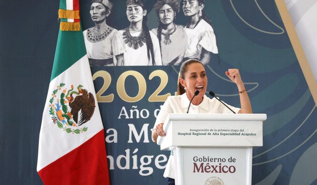 La Presidenta Claudia Sheinbaum anuncia el inicio de un nuevo modelo de distribución de medicamentos durante la inauguración del Hospital de Alta Especialidad de Acapulco.