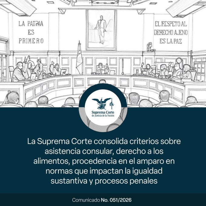 El Pleno de la SCJN resolvió criterios sobre asistencia consular, derecho a los alimentos, acceso a la justicia y transición al sistema penal acusatorio.