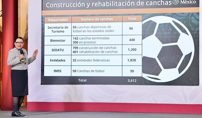 La funcionaria explicó que la Secretaría de Turismo tiene el compromiso de construir 86 canchas, la Secretaría de Bienestar 448, la Sedatu mil 200, el IMSS 50, y los gobiernos estatales aportan mil 828. “En el caso de las 32 entidades federativas, todos los gobiernos de los estados y los gobernadores están participando con mucho entusiasmo”, señaló.