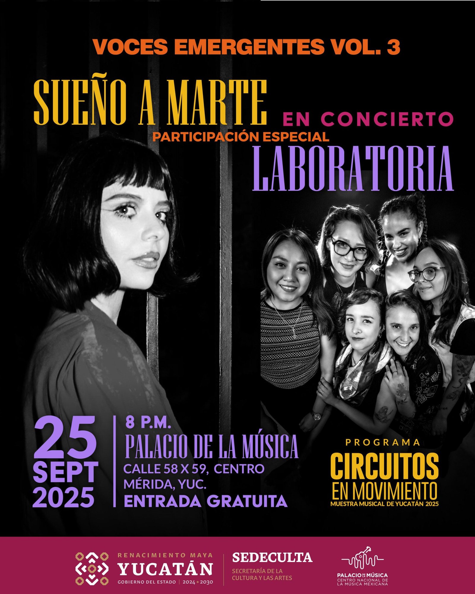 La música independiente encontró su escenario en la Sala de Conciertos del Palacio de la Música, donde el programa Voces Emergentes, impulsado por la Secretaría de la Cultura y las Artes (Sedeculta), celebró su tercera edición con una propuesta sonora que unió a Sueño a Marte, dúo de la Ciudad de México, y Laboratoria, colectivo femenino de Mérida. El concierto se realizó el 25 de septiembre a las ocho de la noche, como parte del cierre de la Muestra Musical Yucatán 2025.