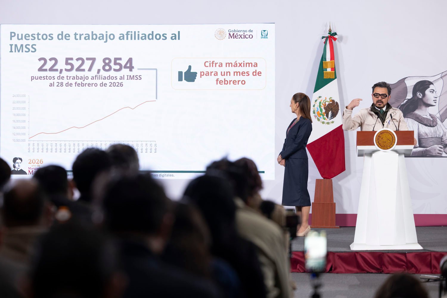 La Presidenta de México, Claudia Sheinbaum Pardo, informó que al 28 de febrero de 2026 se registraron 22 millones 527 mil 854 empleos afiliados al IMSS, la cifra más alta para un mes de febrero en la historia del país. Tan solo en ese mes se crearon 157 mil 882 nuevos puestos de trabajo.