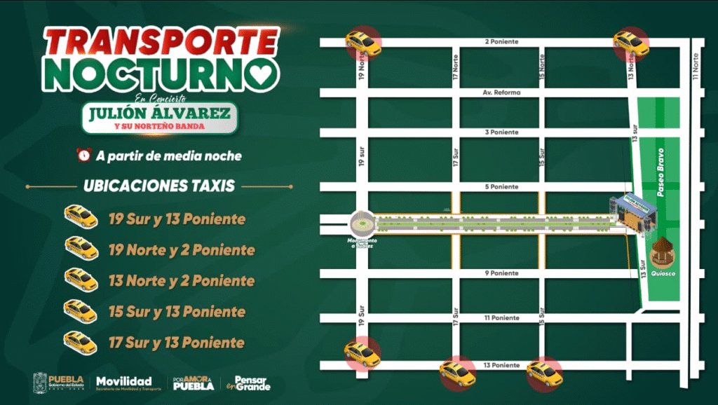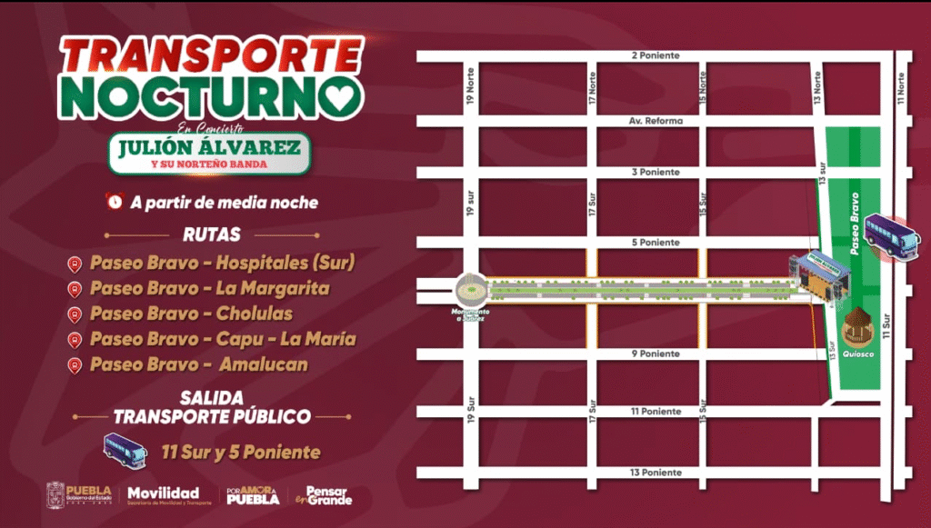 Además, se habilitó transporte público nocturno con cinco sitios de taxi autorizados y cinco recorridos de autobuses que saldrán desde Paseo Bravo hacia La Margarita, Cholula, Capu-La María, Amalucan y hospitales de la zona sur, especialmente tras el concierto de Julión Álvarez.