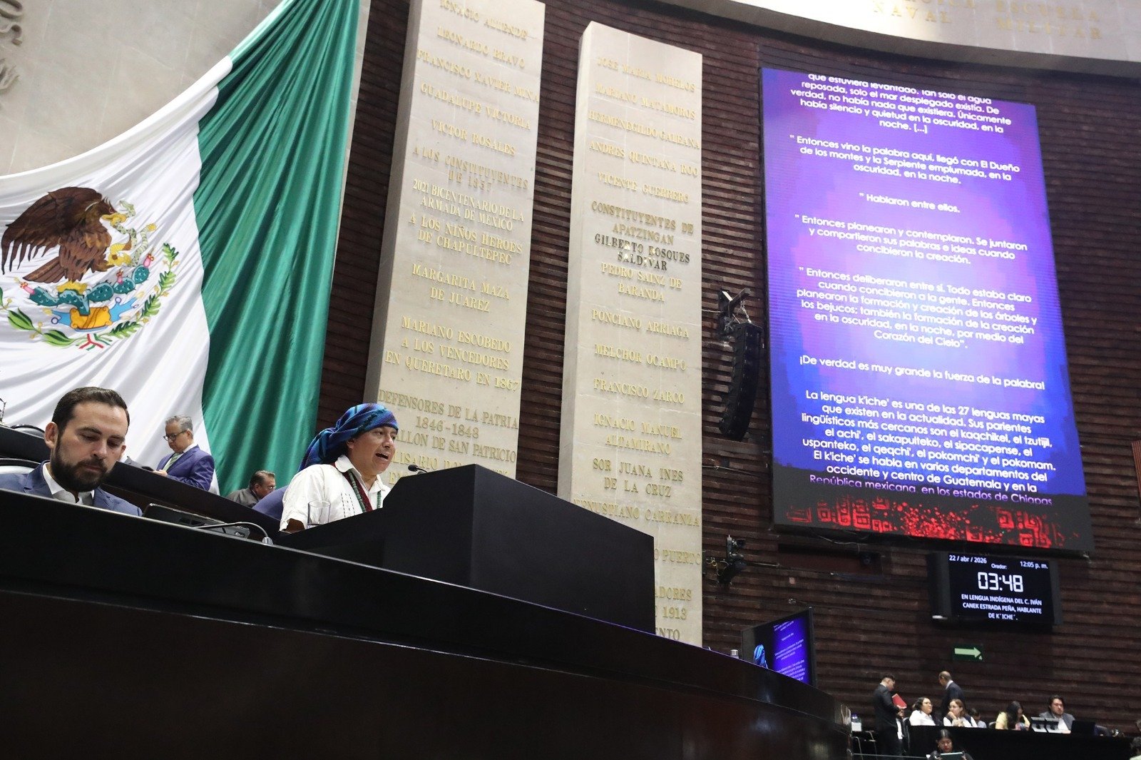 En la Cámara de Diputados, durante la iniciativa “Las lenguas toman la tribuna”, el académico Iván Canek Estrada Peña, hablante de lengua k’iche’, señaló que no basta con motivar su uso, sino que es necesario un medio que permita reproducir la cultura, pues de esa forma se conserva el arraigo a la tierra. “La lengua tiene sentido cuando expresa los principios bajo los cuales entendemos el mundo”, afirmó desde la tribuna.