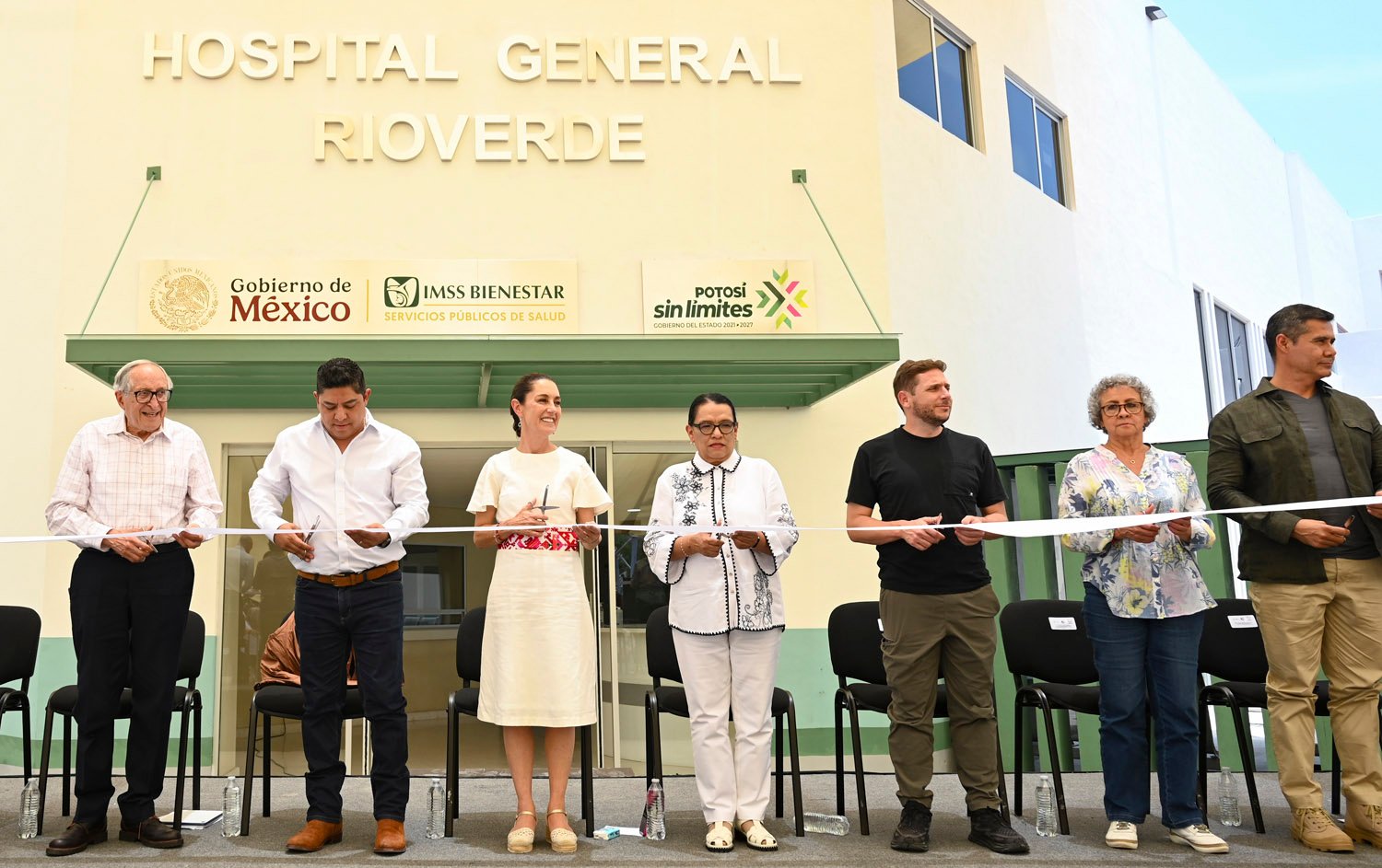 La Presidenta estuvo acompañada por la secretaria de Gobernación, Rosa Icela Rodríguez Velázquez; el subsecretario de Integración Sectorial y Coordinación de Servicios de Atención Médica, Eduardo Clark García Dobarganes; la subsecretaria de Egresos de la SHCP, Bertha Gómez Castro; el director general de BIRMEX, Carlos Alberto Ulloa Pérez; el secretario técnico de la Presidencia y coordinador de Programas para el Bienestar, Carlos Torres Rosas; la coordinadora de Asuntos Intergubernamentales, Leticia Ramírez Amaya; la directora del Hospital General del IMSS Bienestar de Rioverde, Edith Reynaga Hernández y el presidente municipal de Rioverde, Arnulfo Urbiola Román.