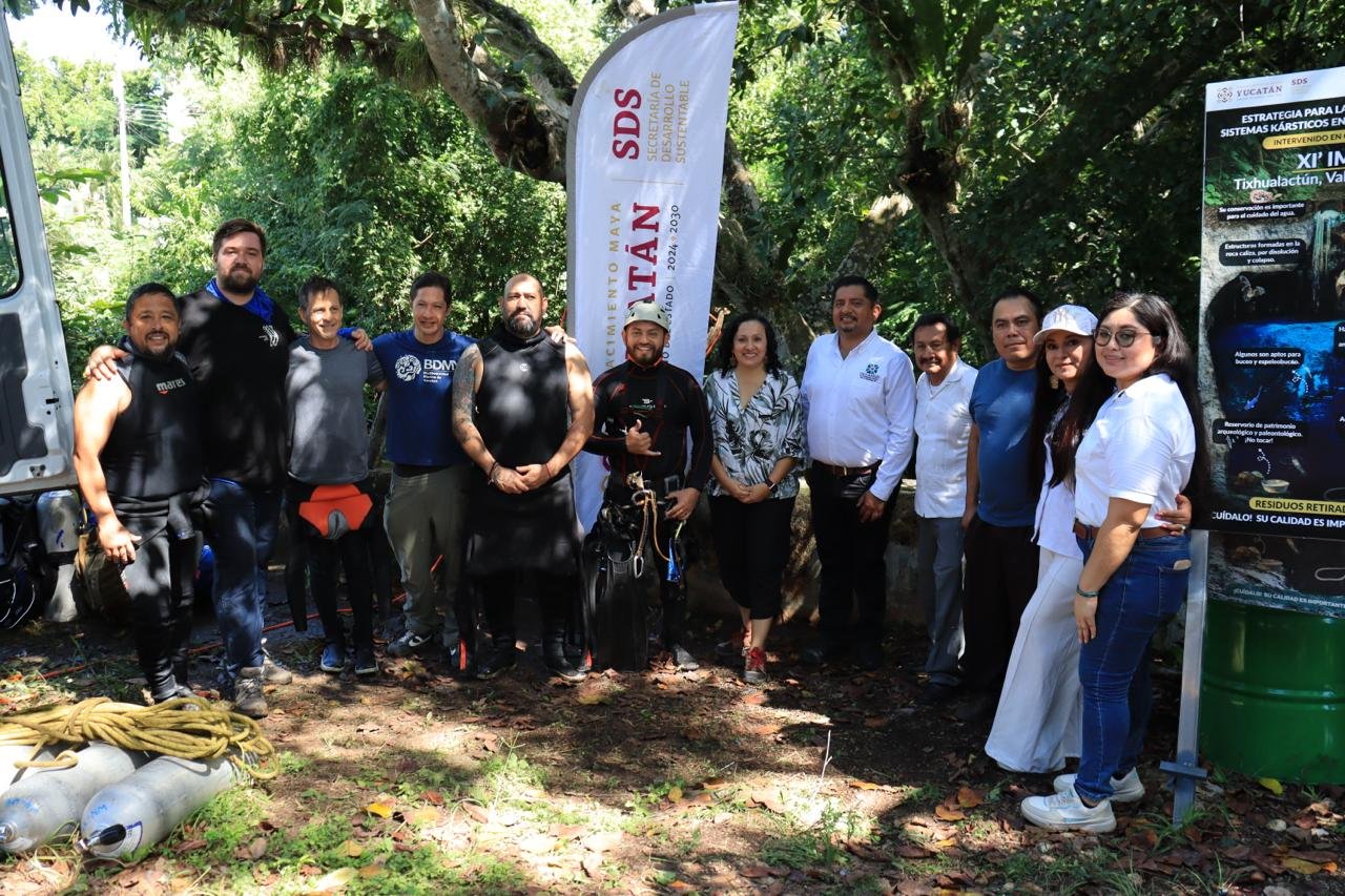 Con entusiasmo, compromiso y participación comunitaria, el Gobierno del Estado de Yucatán, a través de la Secretaría de Desarrollo Sustentable (SDS), llevó a cabo una jornada de saneamiento en el cenote Xi’ Im Há, ubicado en Valladolid, como parte de la Estrategia para la Conservación de los Sistemas Kársticos. La actividad reunió a niñas, niños, jóvenes, buzos especializados, estudiantes de la Universidad de Oriente (UNO) y representantes del sector privado, logrando retirar 152 kilogramos de residuos y entregar árboles nativos en adopción para promover la reforestación.