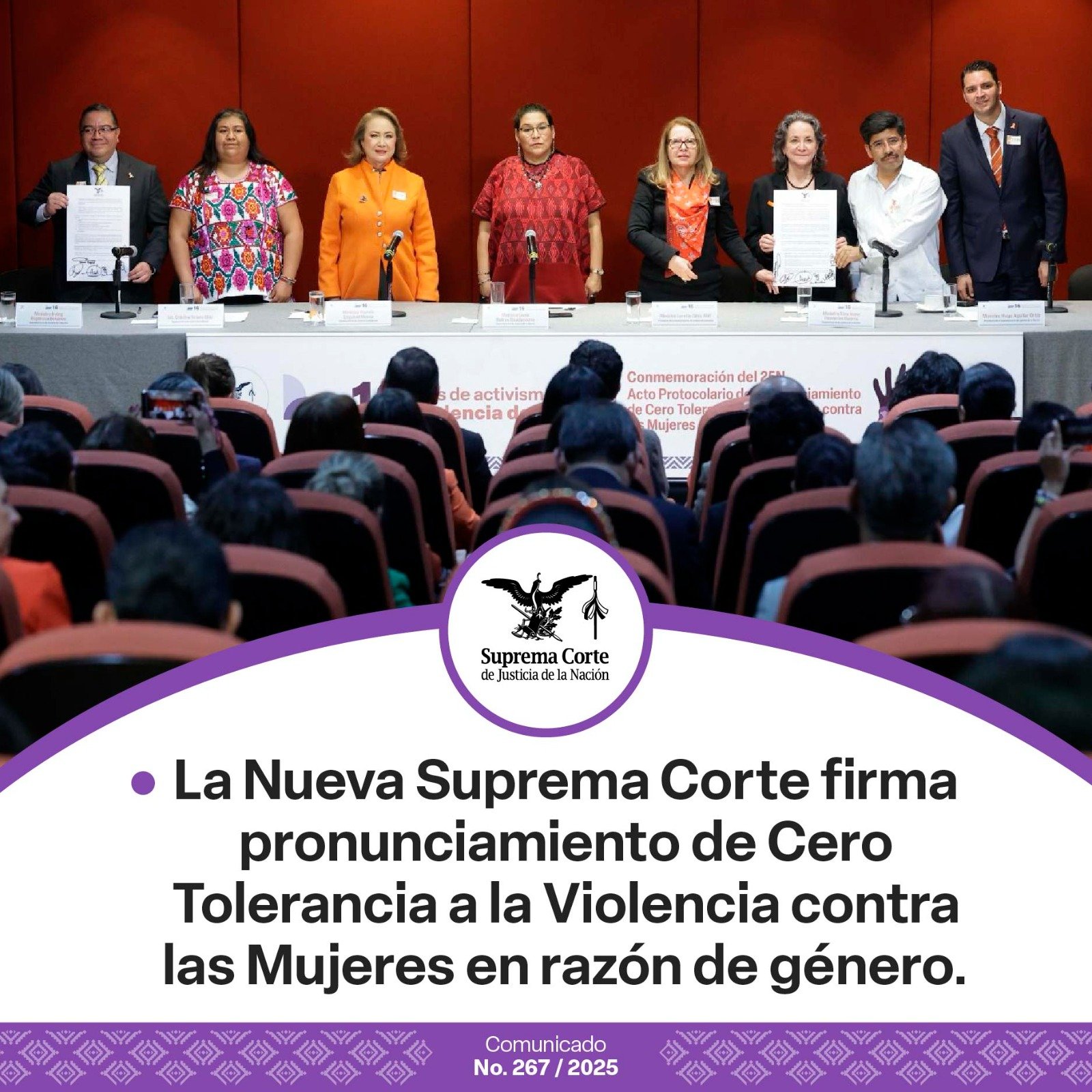 La ceremonia de conmemoración del 25N estuvo encabezada por las ministras Lenia Batres Guadarrama, Yasmín Esquivel Mossa, Loretta Ortiz Ahlf y Sara Irene Herrerías Guerra, junto al ministro presidente Hugo Aguilar Ortizy los ministros Irving Espinosa Betanzo y Arístides Rodrigo Guerrero García, acompañados de colaboradoras del Tribunal.