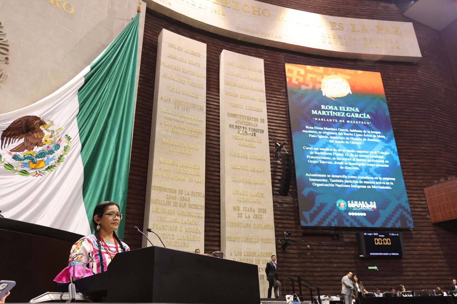 La presidenta de la Mesa Directiva, diputada Kenia López Rabadán, reconoció la participación de Rosa Elena Martínez García, destacando su trayectoria como consultora en la empresa Immunotec y su labor en la organización “Naciones Indígenas en Movimiento”, donde colabora en proyectos a favor de personas indígenas residentes en la Ciudad de México. También informó que cursó estudios de nivel medio superior en el Colegio de Bachilleres, plantel 13, en su localidad.