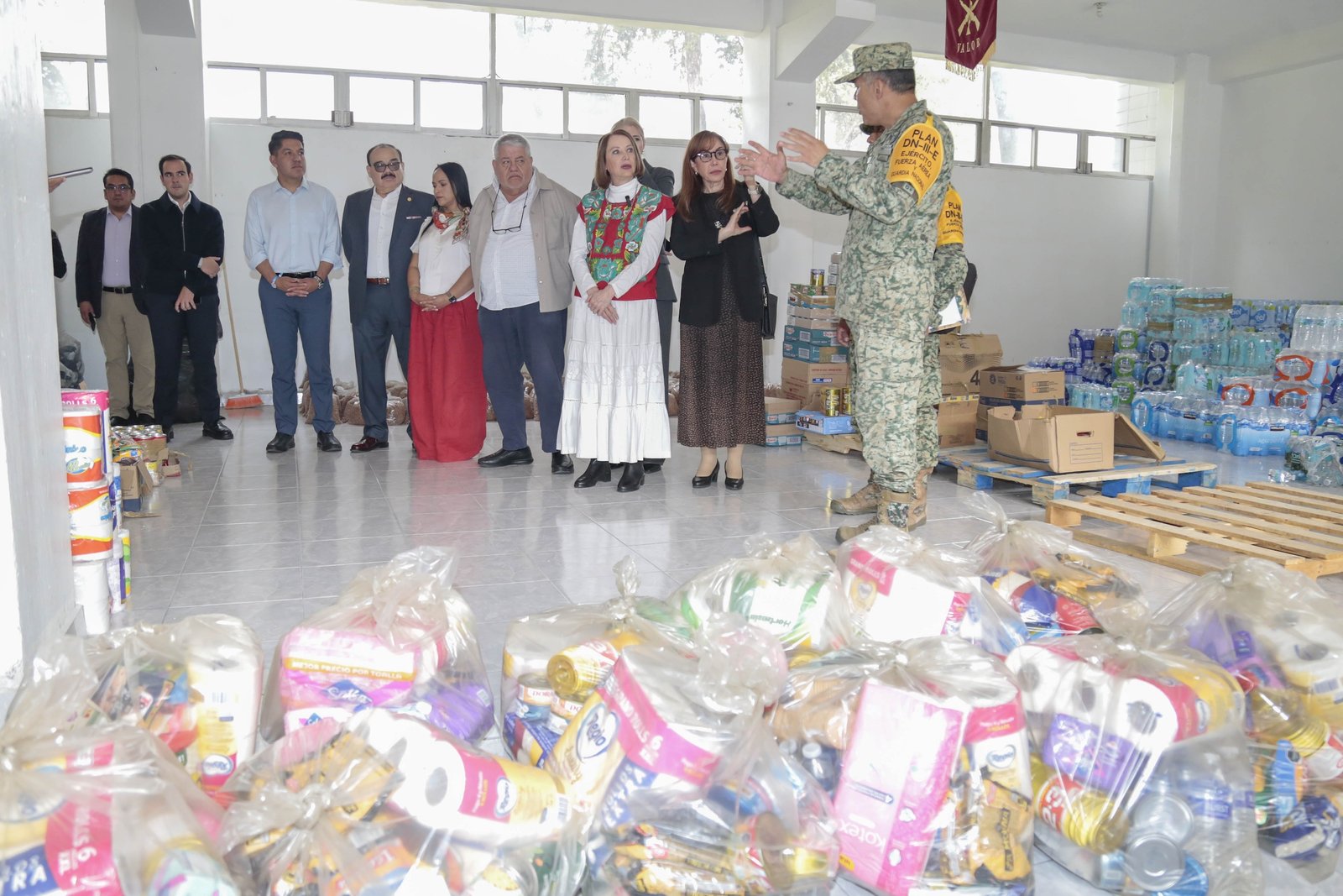 La entrega incluyó 2,300 garrafones de agua de cinco litros, 67,750 botellas de agua de litro y medio, y 9,700 despensas, además de 80,000 despensas adicionales que se distribuirán entre el domingo y lunes. Los víveres fueron recibidos por el coronel de infantería Álvaro Vázquez Zacarías, en representación del Ejército Mexicano, que aplica el Plan DN-III para atender la emergencia.