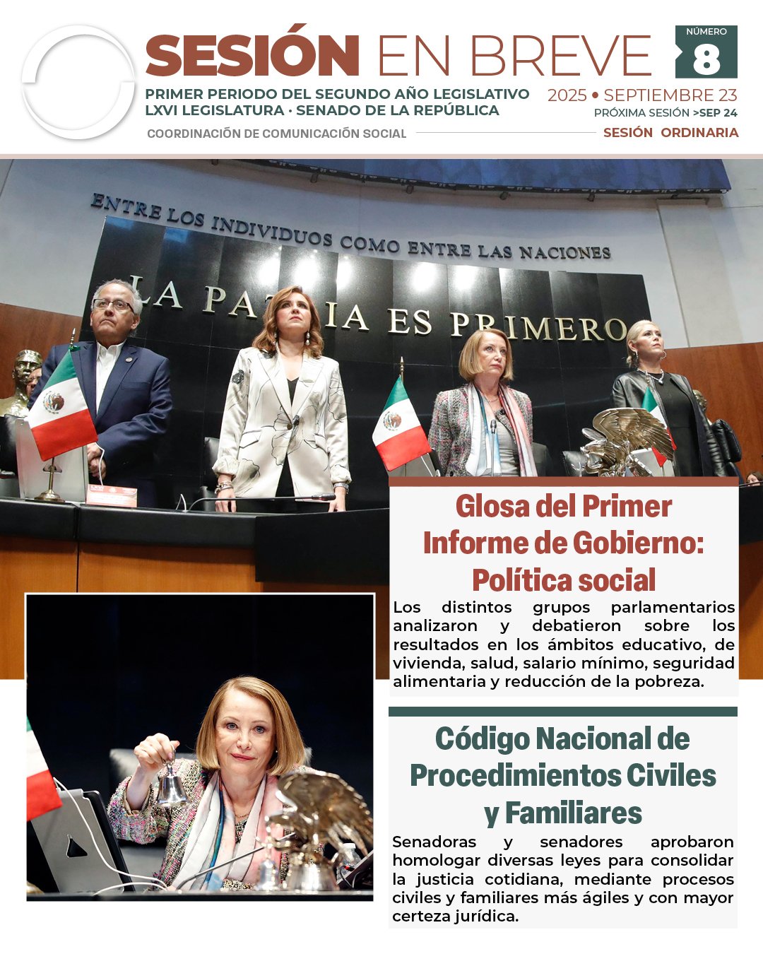 Durante la sesión ordinaria del Senado de la República, celebrada el 23 de septiembre de 2025 en el recinto legislativo de Paseo de la Reforma, se abordaron dos temas de gran relevancia nacional: el análisis del Primer Informe de Gobierno en materia de política social y la aprobación del dictamen para la homologación del Código Nacional de Procedimientos Civiles y Familiares. La jornada legislativa fue conducida por la presidenta de la Mesa Directiva, Laura Itzel Castillo Juárez, quien destacó el compromiso del Senado con la transformación institucional y el bienestar ciudadano.